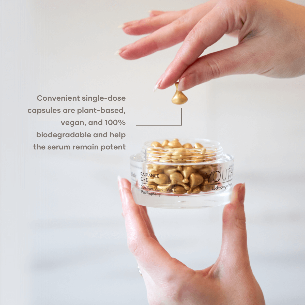 100% vegan, cruelty-free, hypoallergenic, dermatologist- and ophthalmologist-tested, gluten-free, and free from over 2,500 questionable chemicals — pure, clean brilliance in every twist-off capsule.