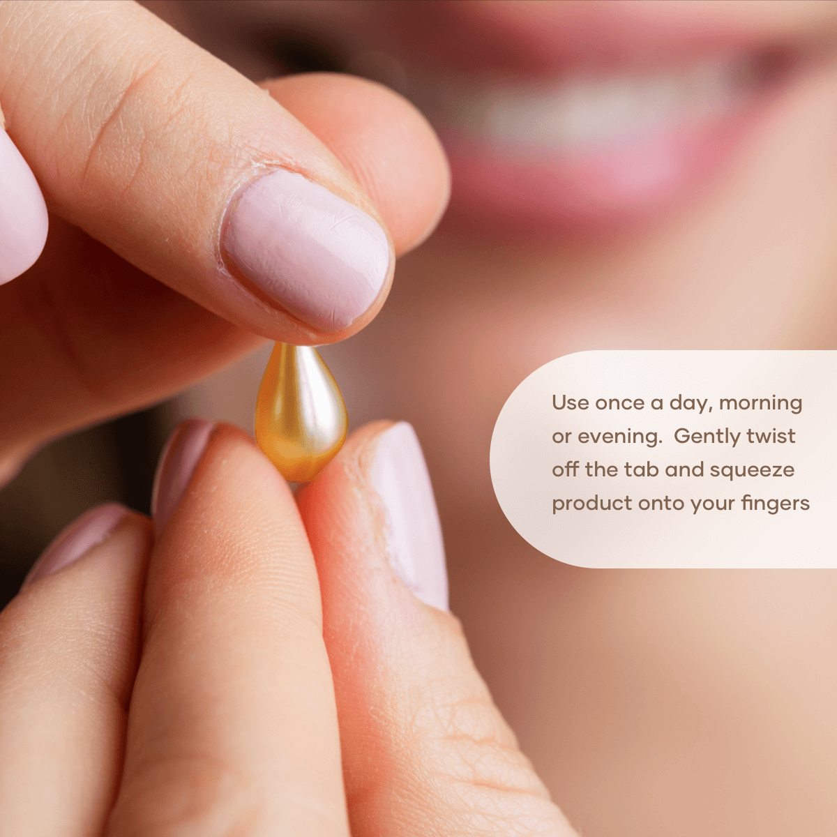 Twist off the capsule tab, squeeze the serum onto clean fingertips, and gently smooth over your face (after toner or YOUTH Activating Serum, if using). Follow with your favorite moisturizer. Use once daily — morning or evening.