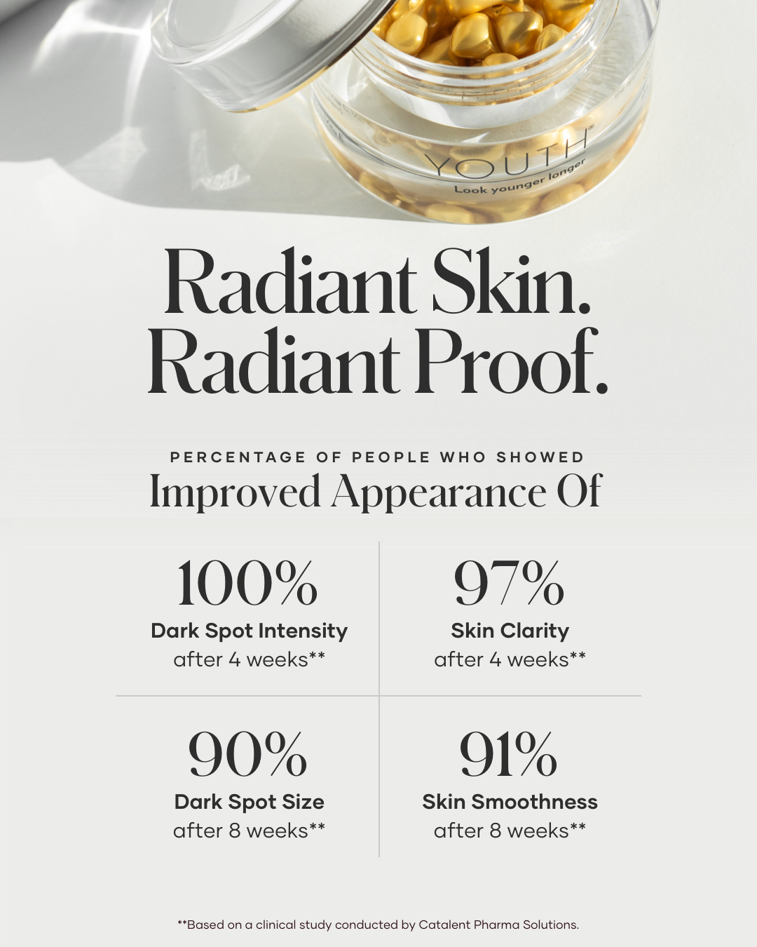 Clinically shown: 100% improved dark spot intensity in 4 weeks, 97% clearer skin, 91% smoother texture in 8 weeks.